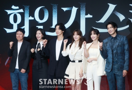 박홍균 감독, 배우 서이숙, 정지훈, 김하늘, 기은세, 정겨운이 2일 오전 서울 여의도 콘래드 호텔에서 진행된 디즈니+ 오리지널 시리즈 '화인가 스캔들' 제작발표회에 참석해 포즈를 취하고 있다.