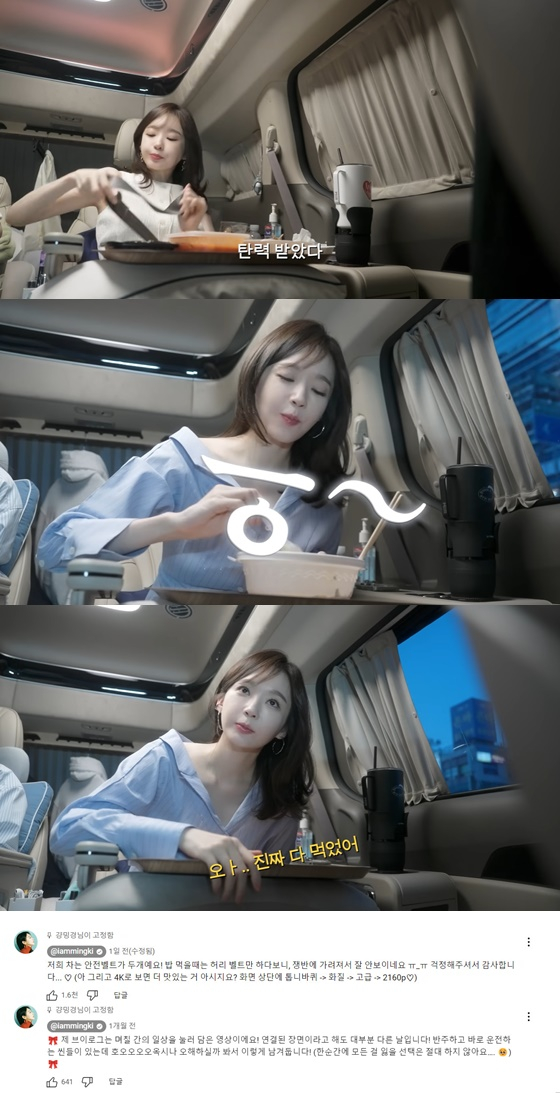 이에 강민경은 혹시 오해가 불거질 것을 대비해 "저희 차는 안전벨트가 두 개다. 밥 먹을 때는 허리 벨트만 하다 보니, 쟁반에 가려져서 잘 안 보인다. 걱정해 주셔서 감사하다"라는 댓글을 썼다.