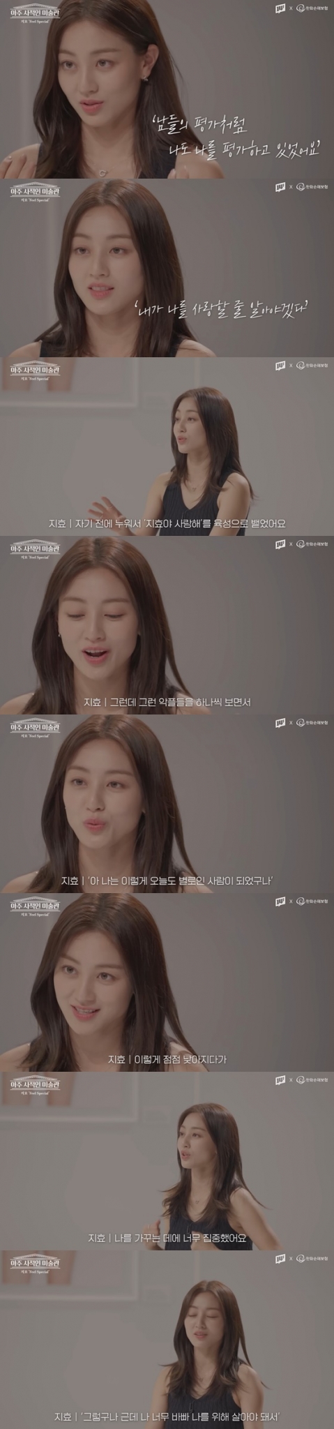 이내 지효는 "매일 스케줄을 하다가 어느 날 거울 보는데 문득 '왜 나는 날 싫어하고 있을까?' 하는 생각이 딱 들었다. 사랑받아야 하는 직업인데, 내가 날 사랑하지 않고 있구나. '내가 날 사랑할 줄 알아야 그래야 사랑받을 수도 있겠다' 하는 생각을 갖게 됐다. 그래서 선택한 방법이 자기 전에 누워서 '지효야 사랑해'를 육성으로 내뱉는 거였다. 진짜 몇 번씩 '현타'(현실 자각 타임)가 왔지만 습관처럼 매일 하다 보니까 진짜로 날 사랑하게 됐다. 모니터를 해도 좋은 구석을 찾아보자 했다. 내가 가진 모습을 장점으로 만들자 하는 생각이 들었다"라고 전했다.