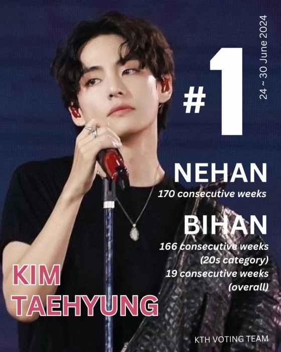 뷔는 6월 24일부터 6월 30일까지 일본 인기 아이돌 랭킹 사이트 '네한'(NEHAN)에서 실시한 'K팝 남자 아이돌 랭킹 투표에서 1위에 오르며, 170주 연속 1위의 대기록을 경신했다.