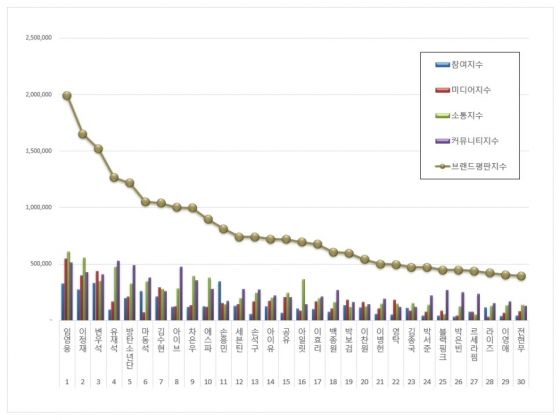 광고모델 브랜드평판 1위를 기록한 임영웅 브랜드는 참여지수 324,315 미디어지수 547,076 소통지수 609,408 커뮤니티지수 510,946이 되면서 브랜드평판지수 1,991,745로 분석됐다.