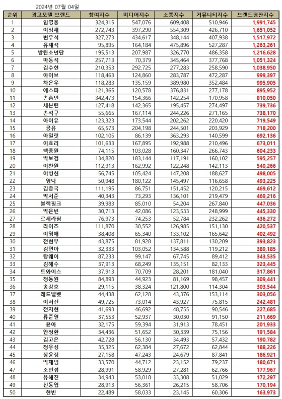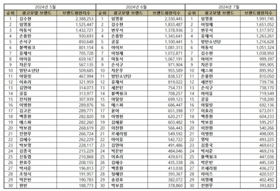 2024년 7월 광고모델 브랜드평판 30위 순위는 임영웅, 이정재, 변우석, 유재석, 방탄소년단, 마동석, 김수현, 아이브, 차은우, 에스파, 손흥민, 세븐틴, 손석구, 아이유, 공유, 아일릿, 이효리, 백종원, 박보검, 이찬원, 이병헌, 영탁, 김종국, 박서준, 블랙핑크, 박은빈, 르세라핌, 라이즈, 이영애, 전현무 순으로 분석됐다.