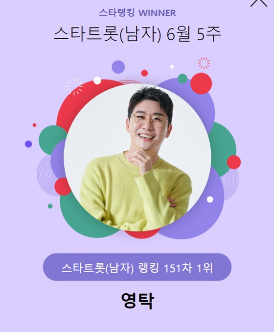 영탁은 지난 6월 27일 오후 3시 1분부터 7월 4일 오후 3시까지 진행된 6월 5주(151차) 스타랭킹 스타트롯 남자 랭킹 투표에서 1위를 유지했다.
