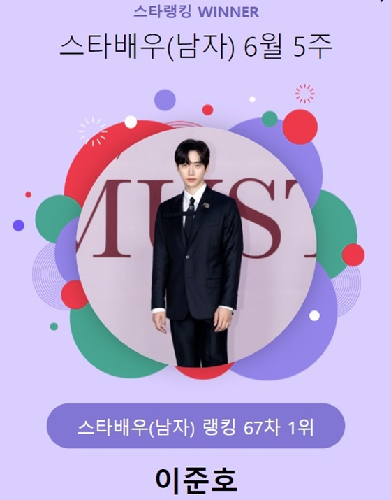 이준호는 지난달 27일 오후 3시 1분부터 7월 4일 오후 3시까지 진행된 6월 5주(67차) 스타랭킹 스타배우 남자 랭킹 투표에서 1위를 차지했다.