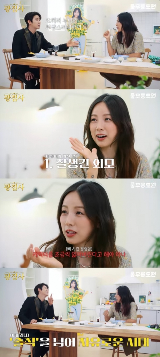 이어 "현장에서 '저 사람들 다 내가 늙었다고 생각하면 어떡하지?'라고 걱정한다. 내가 자신감이 없어지면서 활짝 웃지를 못하겠더라"라며 "원래 자연스러운 걸 좋아해서 그동안 얼굴에 손을 안 댔는데 이제 나이가 들다 보니까 너무 예의가 아니지 않나 싶어서 눈가 주름 때문에 보톡스를 맞았다. 근데 눈웃음을 짓다 보니까 안 웃어지더라. 피부 레이저 시술을 몇 번 받았는데 피부가 너무 얇아서 효과가 없더라"라는 고민을 털어놓으며 광희에게 성형 상담을 받아 웃음을 안겼다.