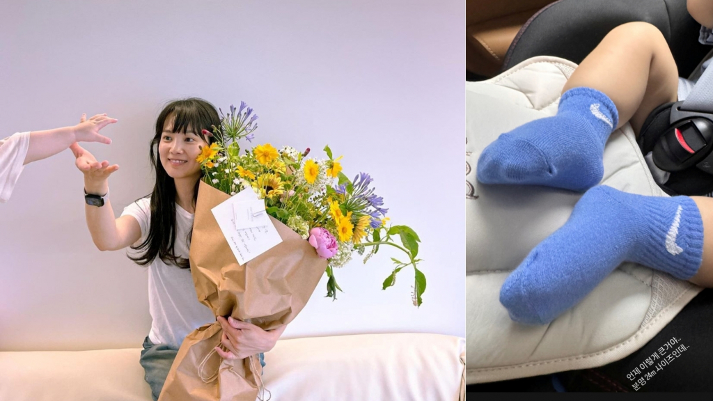 공개된 사진 속에는 양말을 신은 윤승아 아들의 귀여운 발이 담겼다. 포동포동한 발목이 미소를 유발하는 가운데, 윤승아는 하루가 다르게 크는 아들의 성장에 깜짝 놀란 듯 보인다.