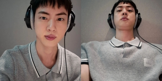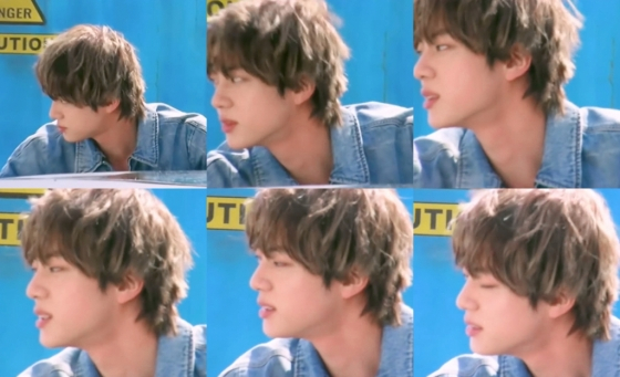 진은 아직 짧은 머리에도 잘생긴 눈썹과 커다랗고 맑은 눈, 조각 같은 코, 도톰한 입술과 작고 갸름한 얼굴형, 매끄러운 꿀피부로 지난 달 제대한 사람이라고 믿어지지 않을만큼 최고의 미모를 자랑했다. 녹음 중인 듯 헤드폰을 착용한 진의 소두와 태평양 어깨는 피지컬조차 우월한 황금비율임을 실감케했다.