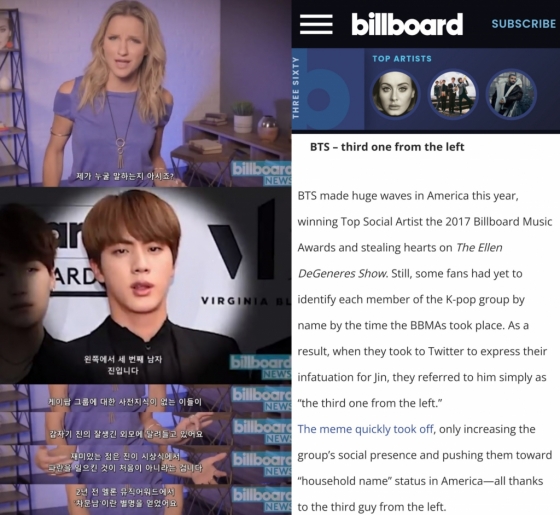 이에 빌보드는 한 해의 밈(MEME)으로 '왼세남'(왼쪽에서 세 번째 남자, third one from the left)을 꼽았다. 압도적인 외모로 화제성 끝판왕으로 불리는 진은 대중들의 쏟아지는 질문과 궁금증으로 '차문남, 유엔총회남, P5남, 봄버자켓남, 핑크 마이크가이, 오렌지 수트 가이' 등 수십가지 별명을 가지고 있다.