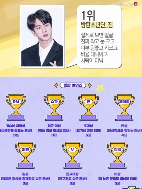 '실물 1위 연예인'으로 꼽히는 진은 방탄소년단 멤버들, 연예인들, 스태프들 등에게도 최고의 얼굴로 뽑히며 찬사를 받고 있다.