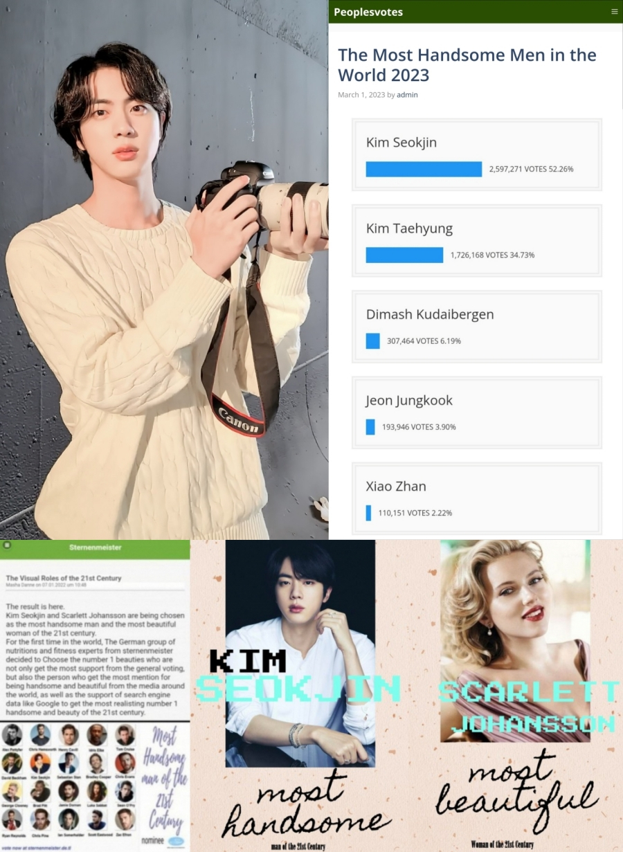 진은 '세계 최고 미남 1위' 등 팬들과 대중은 물론 세계의 각 전문가가 선정한 수많은 '미의 남신' 미의 남신 타이틀의 주인공이며 세계의 각종 비주얼 투표를 휩쓸고 있다. 독일 '스턴마이스터'(Sternmeister)로부터 미국 배우 스칼렛 요한슨과 함께 '21세기 최고 미남미녀'로도 뽑혔으며 국내외 성형외과의들에게 최고의 얼굴, 가장 완벽하고 이상적인 황금 비율 이목구비로 분석됐다. 최근 국내 성형외과의들에 의해 남성 고객들이 가장 원하는 얼굴이 진이라는 사실이 밝혀지기도 했다.