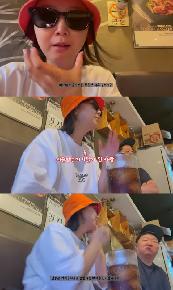 다음 날 한유라는 가족, 지인들과 함께 '치맥'(치킨과 맥주) 모임을 가졌다. 이 자리에서 한유라는 선글라스를 착용하고 있어 눈길을 끌었다.