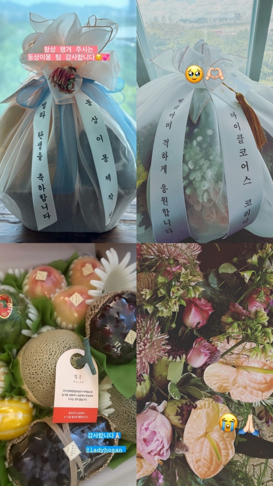 공개된 사진 속에는 SBS 예능프로그램 '동상이몽2 - 너는 내 운명'에서 선물한 꽃바구니, 김윤지와 인연을 맺은 병원, 브랜드 등에서 선물한 꽃과 과일 등이 담겨있다. 김윤지는 이모티콘을 통해 고마운 마음을 표현했다.