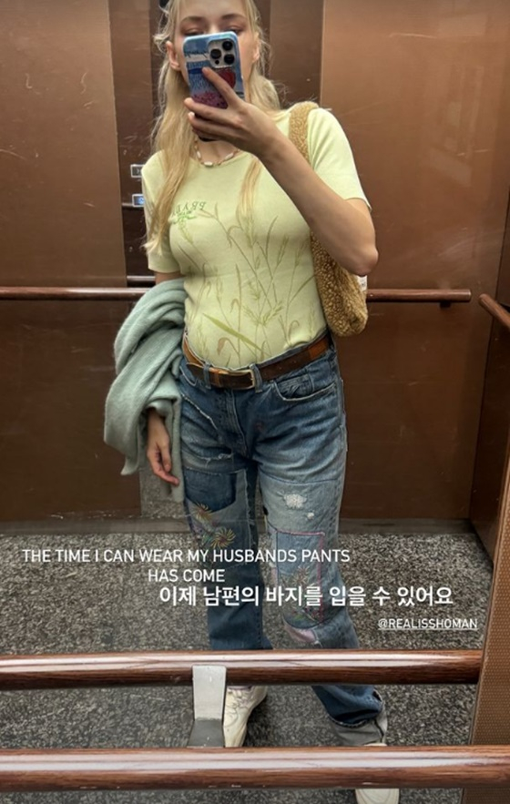 임신 중인 그는 또렷한 D라인을 자랑했다. 배가 점점 불러오며 남편의 바지를 착용할 수 있게 된 그는 건강한 모습으로 눈길을 끌었다.