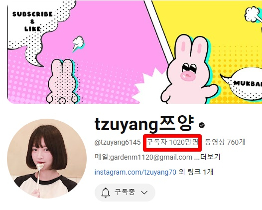 11일 오후 7시 기준 유튜브 채널 'tzuyang쯔양'의 구독자 수는 1020만 명을 나타내고 있다. 쯔양이 전 남자친구에 대한 폭로를 하기 전 구독자 수는 1010만 명이었던 것에 비해 현재는 10만 명의 구독자 수가 늘어난 것을 확인할 수 있다.