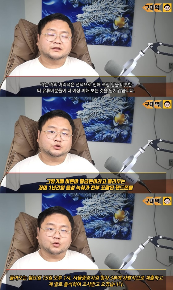 지난 13일 구제역은 자신의 유튜브에 '서울중앙지검 형사 3부에 황금폰 제출하고 자진 출석하겠습니다'라는 제목의 영상을 올렸다.