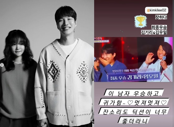 14일 문지인은 "이 남자 우승하고 귀가함~ 멋져멋져. 잔소리도 딕션이 너무 좋더라니"라며 김기리의 우승을 기뻐했다.