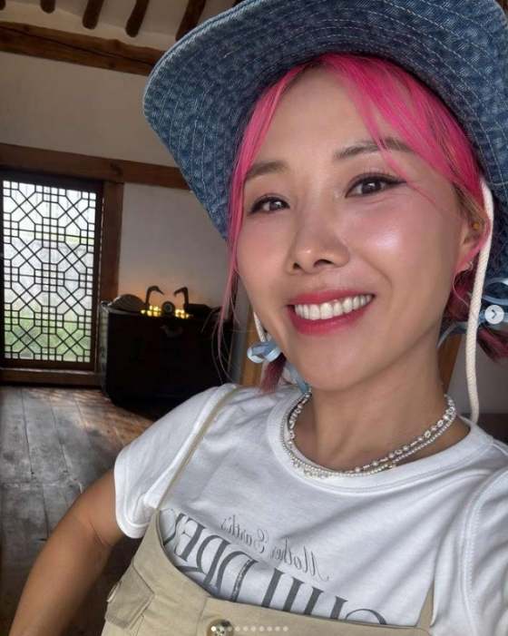사진 속 신봉선은 강렬한 형광핑크색 탈색 머리를 하고 최근 11kg을 감량한 만큼 슬림해진 체형을 자랑했다.