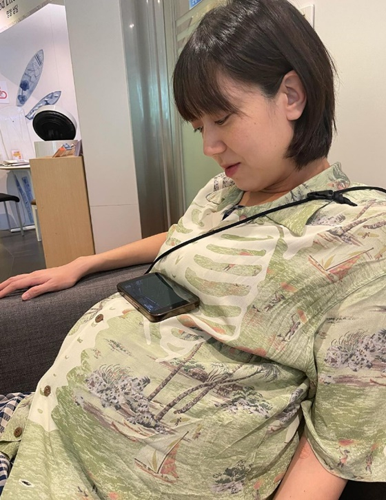 이은형은 휴대폰을 배 위에 올리고 만삭인 배를 휴대폰 거치대로 삼고 있다. 그는 손을 쓰지 않고도 편하게 휴대폰 화면을 바라보고 있다.