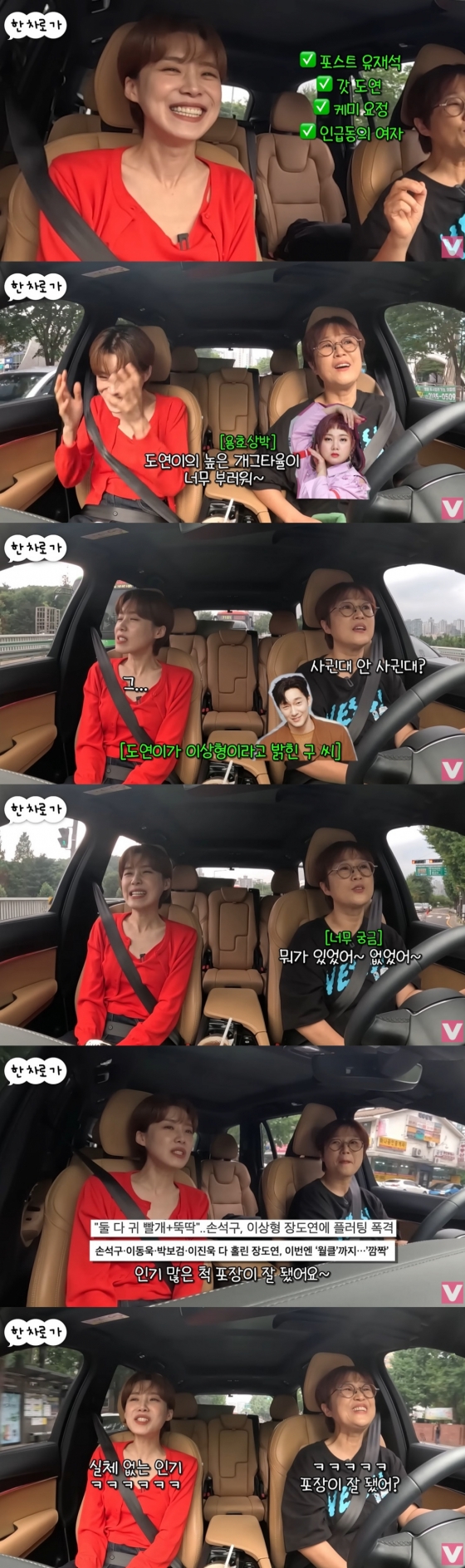 송은이는 유튜브에서 화제를 모았던 장도연과 손석구의 만남을 언급했다. 앞서 손석구는 다수의 프로그램을 통해 자신의 이상형이 장도연이라고 밝혔고, 그는 장도연이 진행하는 유튜브 채널 '살롱드립'에 출연해 핑크빛 무드를 형성한 바 있다.
