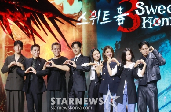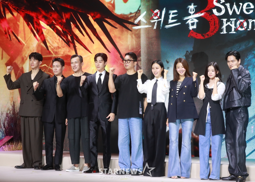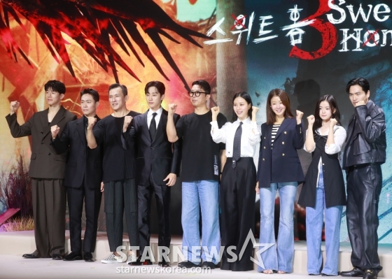 17일 오전 서울 종로구 JW 메리어트 동대문 스퀘어 서울에선 넷플릭스 새 오리지널 시리즈 '스위트홈3' 제작발표회가 열렸다. 연출자 이응복 감독을 비롯해 출연 배우 이진욱, 이시영, 고민시, 진영, 유오성, 오정세, 김무열, 김시아 등이 참석했다.