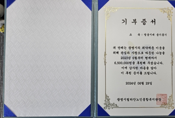 지난 17일 71회차 봉사를 마친 '웅기종기'의 지난해 6월부터 1년간 광명시립하안노인종합복지관 후원금 총액은 650만 원이다.