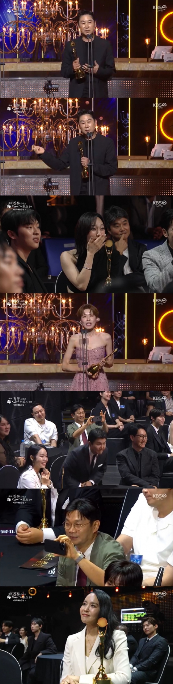 신동엽은 "사실 상하고 인연이 많은 편은 아니었다. 시상식에 오면 상을 받건 안 받건 좋은 기운을 받는다. 제가 즐겨보는 작품의 분들을 시상식에서 만나는 건 큰 행복이다"라며 "제가 데뷔한지 30년이 넘고 수많은 프로그램을 해왔지만 'SNL'은 저의 아이덴티티와 같은 프로다. 'SNL'을 할 때만큼은 너무나도 많은 스트레스를 받고 마라톤 회의를 하고 대본을 고치는 작업을 한다. 그걸 10년 하면서 일반 스트레스와 다른 유쾌한 스트레스를 받는데 앞으로도 유쾌한 스트레스를 받고 싶다"라고 수상 소감을 밝혔다.