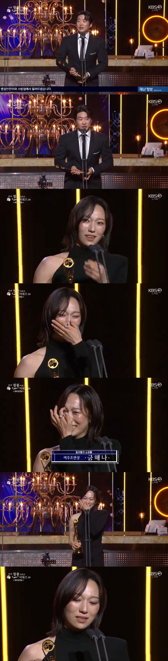 금해나는 눈물을 보이며 "제가 정말 작은 산골마을에서 태어나서 온 동네가 키워줬다. '킬러들의 쇼핑몰'이 저에게 그런 작품이었다. 아무 경험도 없는 제가 너무 큰 역할을 맡아서 한 순간도 제가 혼자 연기한 순간이 없었다. 이런 상을 받게 될 줄 몰랐다. 감사하다"라고 전했다.