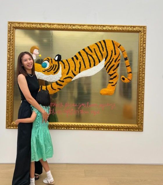 조윤희는 미술관에 전시된 작품 앞에서 포즈를 취해 보였다. 딸과 함께 미술관을 방문한 그는 소중한 딸을 품에 안고 있다.