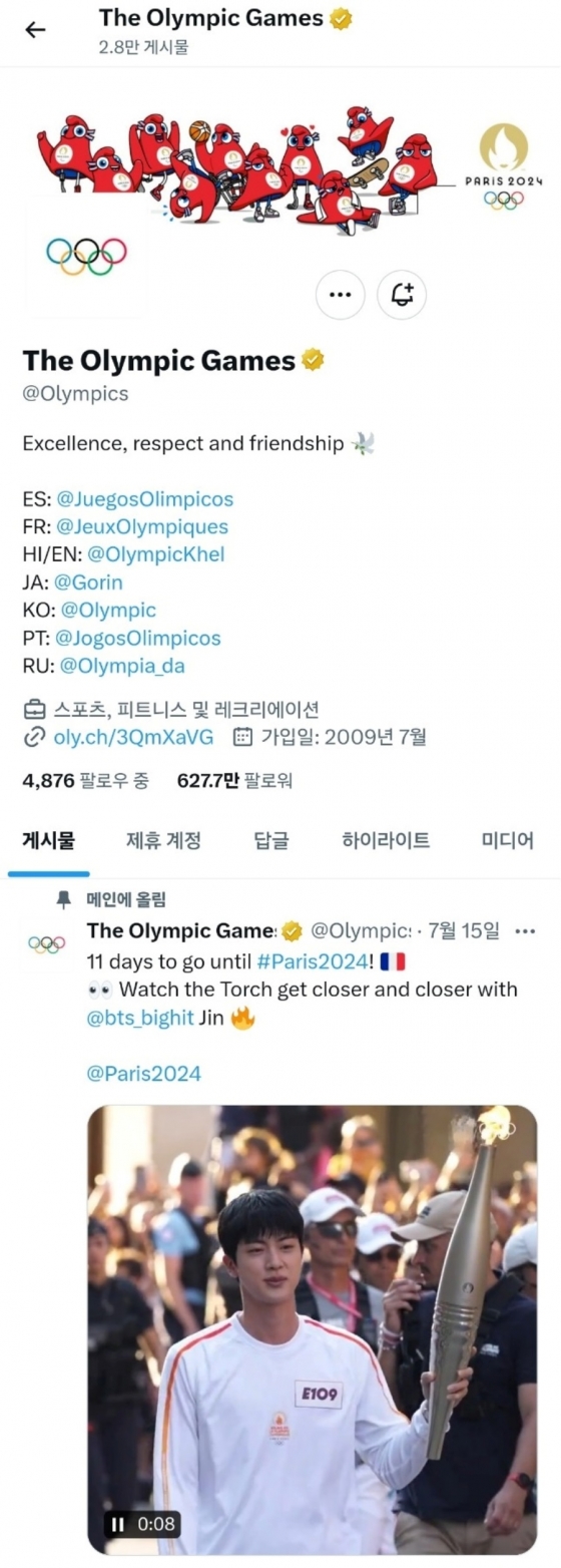 올림픽 X(옛 트위터) 공식 계정(@Olympics)은 진이 성화 봉송하는 모습을 최상단인 메인에 고정, 전 세계가 주목하는 진을 파리 올림픽 홍보 전면에 내세웠다.