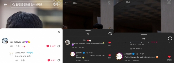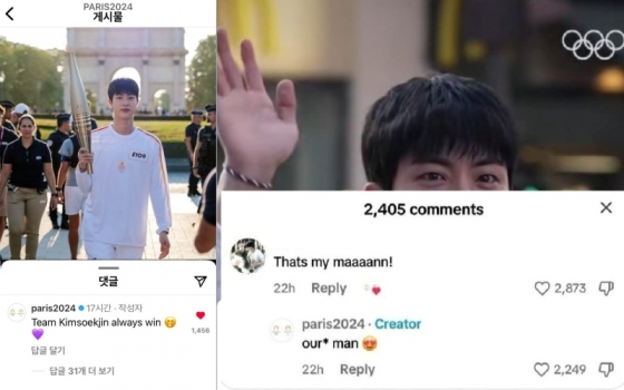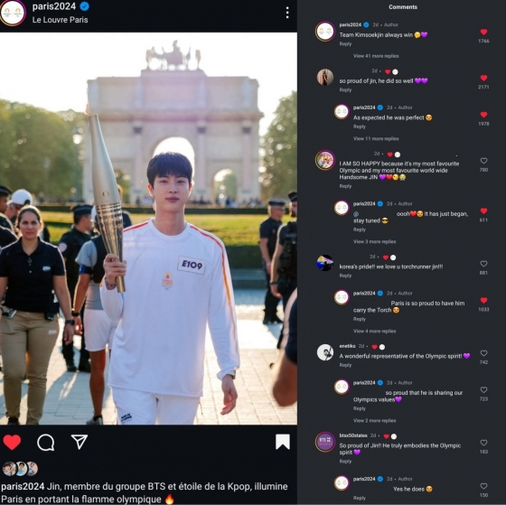 파리 올림픽 인스타그램 공식계정은 진의 모습이 담긴 게시물에 "김석진 팀은 항상 이긴다"는 댓글을 남기는 한편, 한 팬의 "내 남자!"라는 댓글에 "우리의 남자"라는 댓글을 달며 큰 애정을 나타냈다.