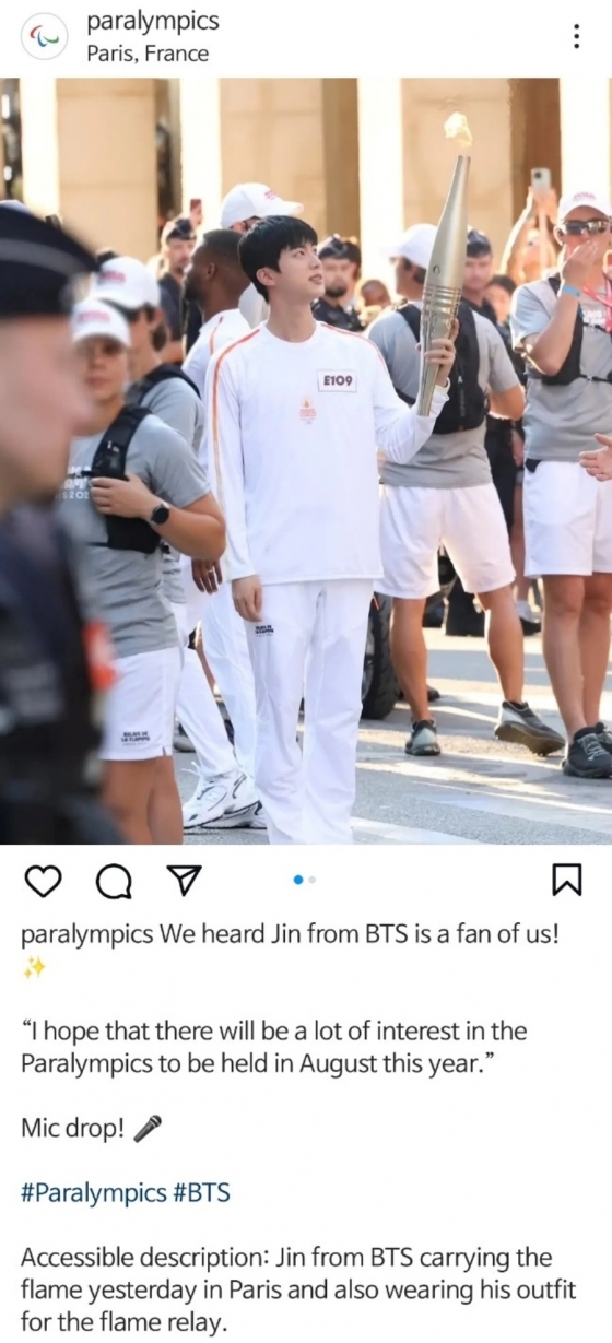 패럴림픽 올림픽 계정 또한 진의 게시물을 올려 "올해 8월 열리는 패럴림픽에 많은 관심이 있었으면 좋겠다"라는 진의 말을 인용하며 방탄소년단의 노래 마이크 드롭!이란 표현으로 '성공'했다는 뜻을 나타냈다.