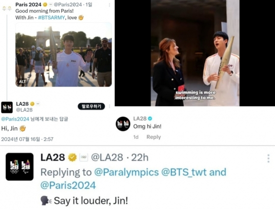 2024 파리 올림픽의 다음 올림픽인 2028 미국 LA 올림픽 공식 계정 또한 파리올림픽 공식 계정이 게재한 진의 게시물에 "오마이갓 하이 진!" 등의 댓글을 남기며 깊은 팬심을 표현했다.