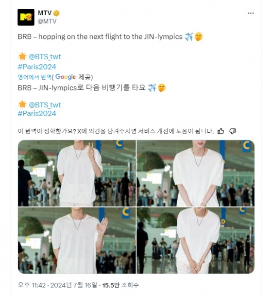 미국 MTV 공식 계정은 '진림픽'이라는 표현을 사용하며 이번 올림픽에서의 진의 최고의 인기와 화제성을 드러냈다.