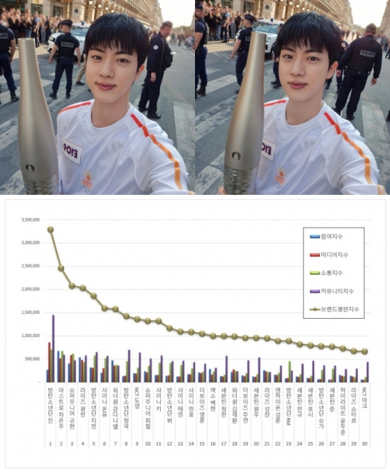 진은 모든 성화봉송주자 중 전 세계에서 가장 많은 주목과 관심을 받았다는 언론 평을 들으며 화제성을 휩쓰는 등 대표 글로벌 슈퍼스타로서 최강의 영향력을 뽐냈다.