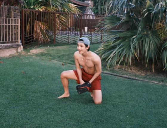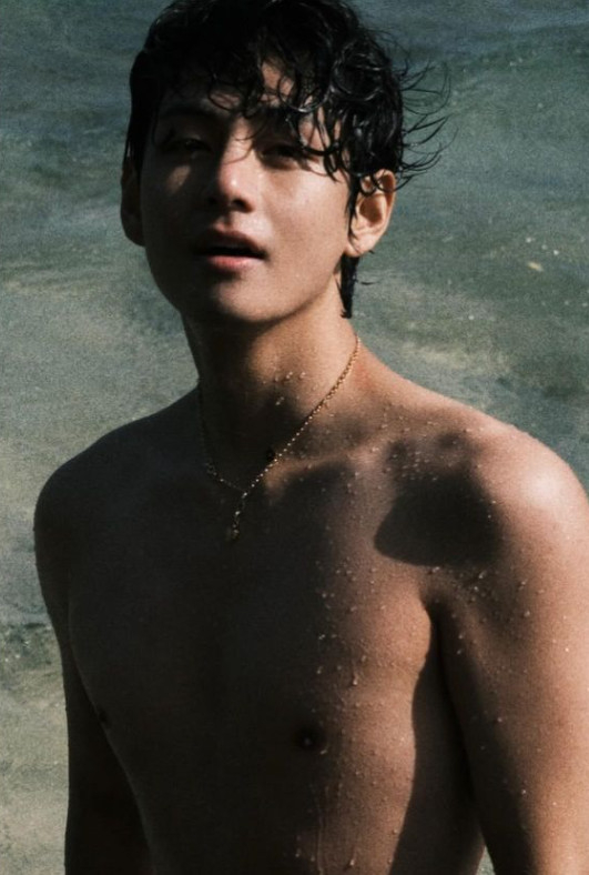 공개된 사진 속엔 뷔가 이전과 다르게 벌크업하고 상의 탈의한 모습이다. 그의 완벽한 복근이 돋보여 이목을 끈다.
