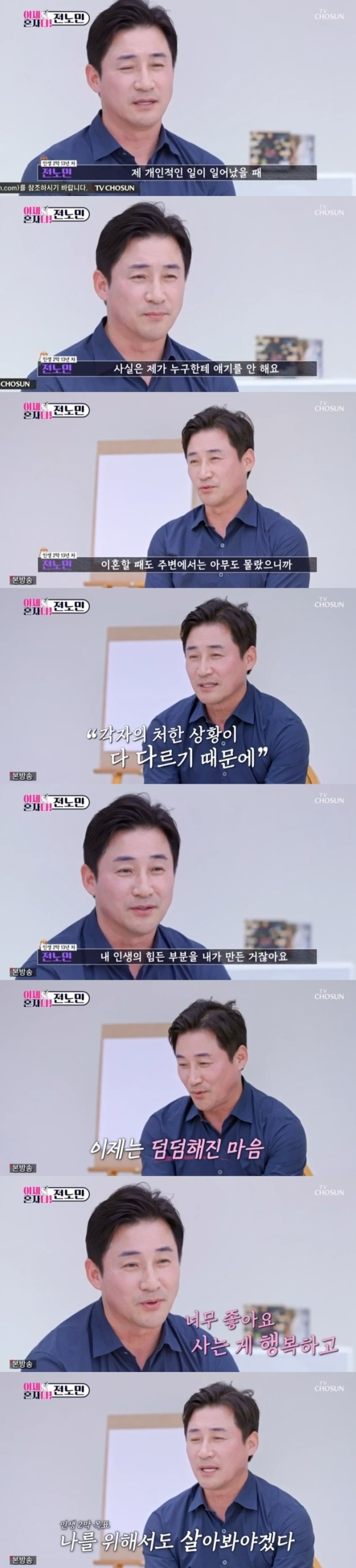 전노민은 16일 방송에서도 두 번의 이혼을 겪으며 배운 인생에 대한 속내를 전했다. 전노민은 첫 번째 이혼 후 배우 김보연과 재혼 후 이혼 과정에 대해 "드라마를 하면서 만났고, 또 다시 두 번째 작품에서 만났다. 가까워져서 결혼도 했다. 그런데 어떤 이유로든 서로 안 맞아서 헤어졌다"라고 설명했다.