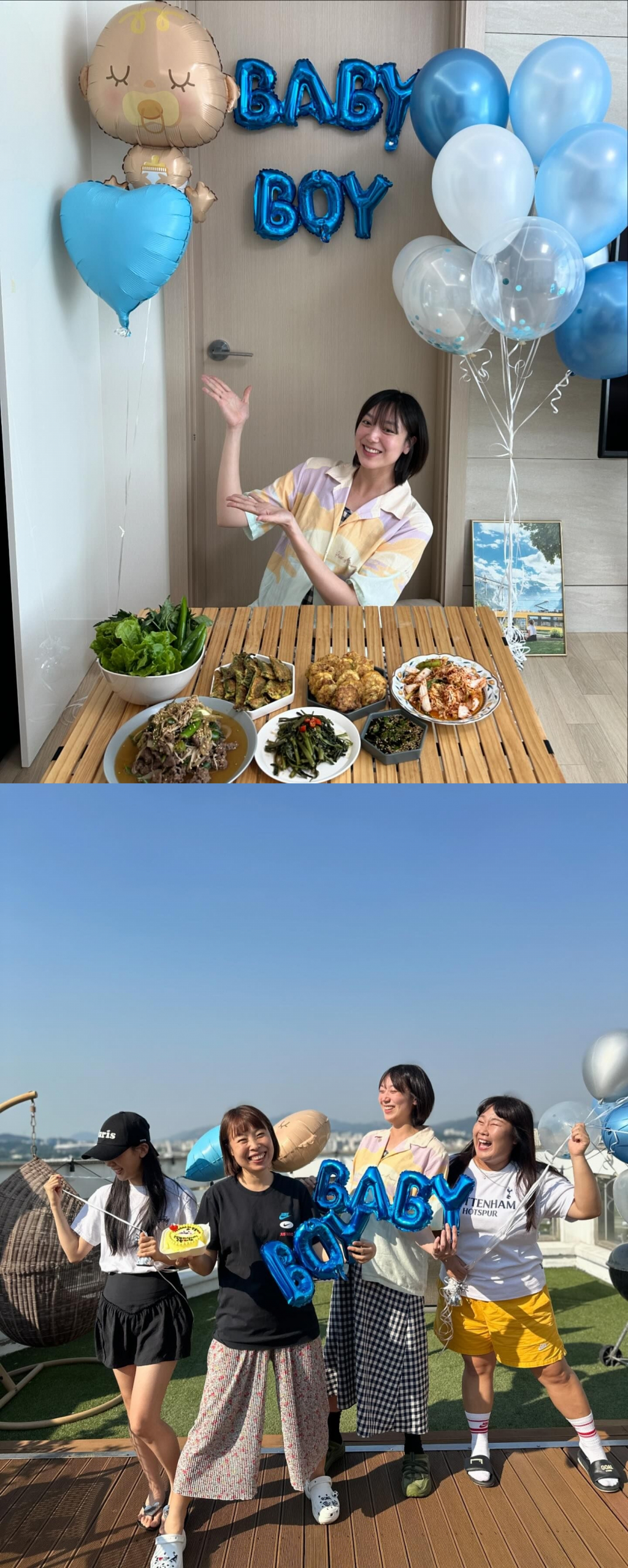 공개된 사진 속에는 이은형을 위한 깜짝 베이비샤워를 준비한 김민경, 오나미, 박소영과 이에 미소 짓는 이은형의 모습이 담겼다. 그는 "나미가 밤새 준비한 모둠전, 불고기, 공심채, 겉절이, 미역국"이라며 한 상 차림에 감동한 모습을 보였다.