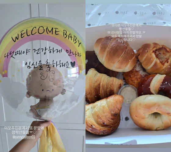 공개된 사진 속 이웃이 선물한 풍선에는 '다섯째야 건강하게 만나자. 임신을 축하해요'라는 문구가 적혀있다. 또한 정주리는 다양한 종류의 빵 사진을 공개하며 "또 다른 이웃 주민분께서 빵 선물을. 이 감사함을 어찌 전할까요. 모두 축하해 주셔서 정말 감사합니다"라고 전했다.