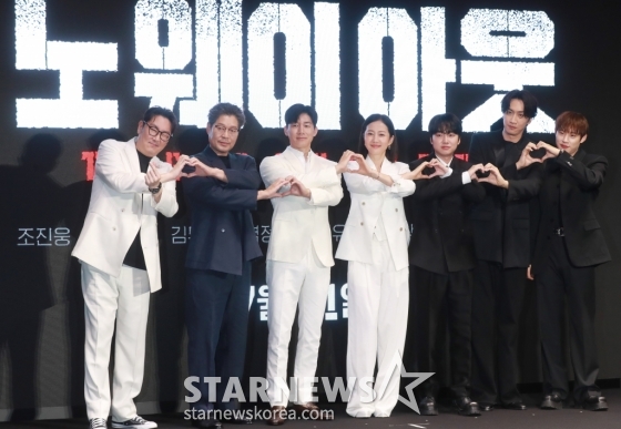 배우 조진웅, 유재명, 김무열, 염정아, 성유빈, 이광스, 김성철이 24일 오전 서울 여의도 콘래드 호텔에서 진행된 디즈니+ 오리지널 시리즈 '노웨이아웃: 더 룰렛' 제작발표회에 참석해 포즈를 취하고 있다.