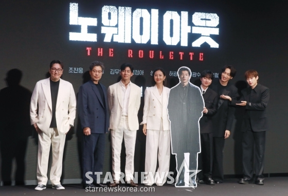 배우 조진웅, 유재명, 김무열, 염정아, 성유빈, 이광스, 김성철이 24일 오전 서울 여의도 콘래드 호텔에서 진행된 디즈니+ 오리지널 시리즈 '노웨이아웃: 더 룰렛' 제작발표회에 참석해 포즈를 취하고 있다.