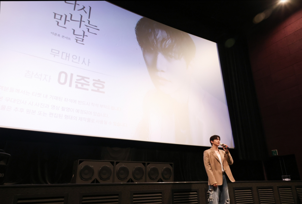 이준호는 24일 솔로 콘서트 '다시 만나는 날'의 실황 개봉을 기념해 서울 용산구와 영등포구에 위치한 CGV 극장에서 무대인사를 진행하고 팬들을 만났다. 이번 영화는 1월 13일과 14일 서울 송파구 잠실실내체육관에서 개최된 동명의 단독 콘서트를 영상화한 것으로 CGV 단독 개봉 소식과 함께 뜨거운 반응을 얻었다.