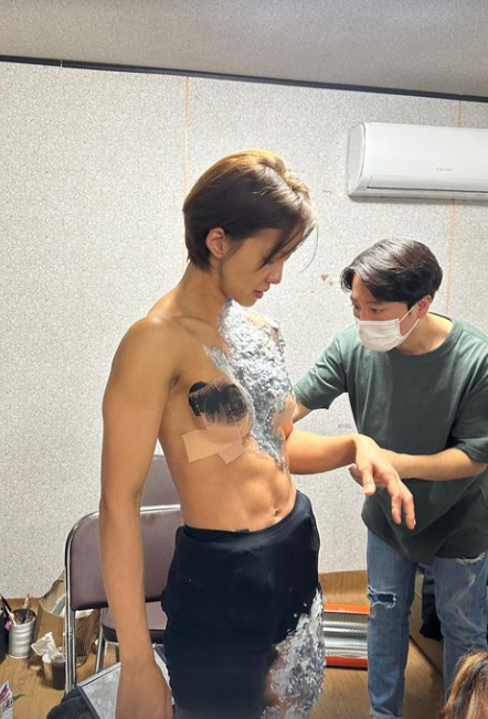 이시영은 사진에서 특수분장을 받고 있다. 이 과정에서 이시영은 가슴만 가린 채 상체를 벗고 있어 놀라움을 자아낸다.