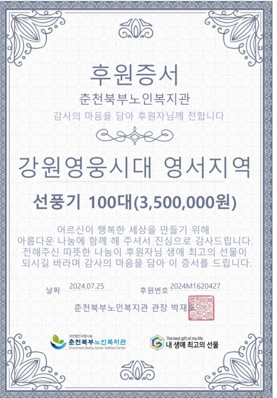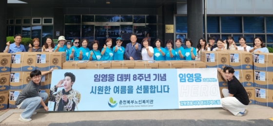 임영웅 팬클럽 '강원영웅시대 영서지역'은 임영웅 데뷔 8주년(8월 8일)을 기념해 7월 25일 사단법인 사랑나눔 춘천북부노인복지관(관장 박재호)에 350만 원 상당 선풍기 100대를 후원했다.