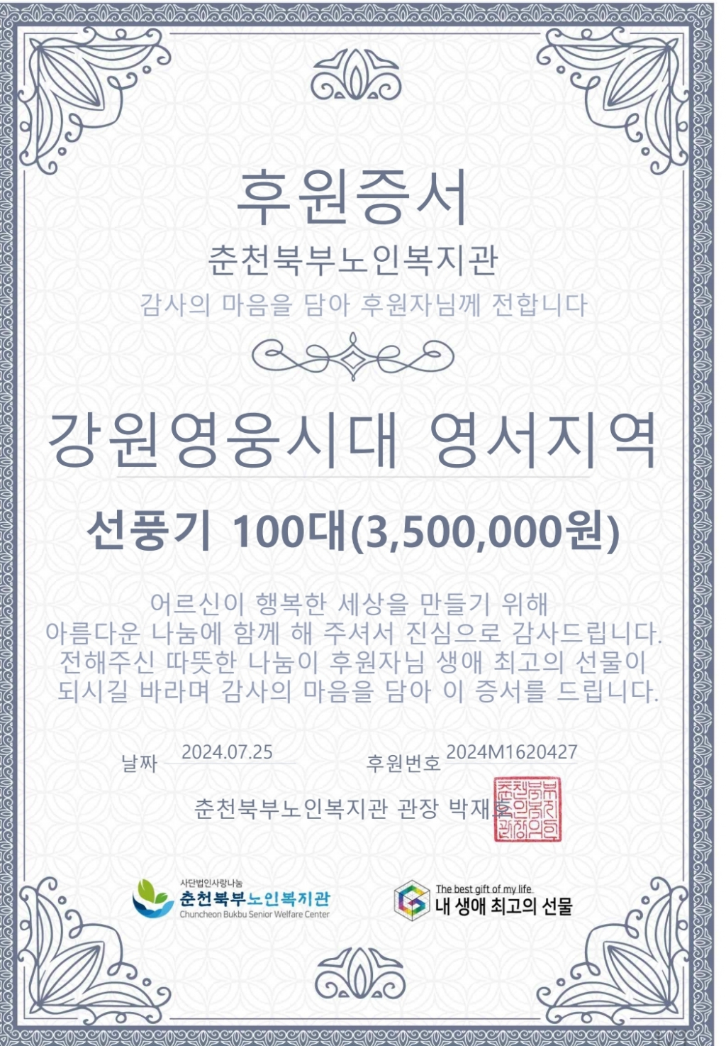 춘천북부노인복지관 박재호 관장은 "지역사회 어르신들의 시원한 여름 나기를 응원하는 '강원영웅시대 영서지역'의 후원에 감사하다"며 "임영웅과 함께 하는 강원영웅시대와 장기적으로 함께 노력할 예정"이라고 전하였다.