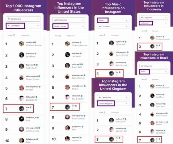 뷔의 인스타그램을 가장 많이 팔로잉하고 있는 나라는 미국으로, 팔로워 전체의 18%인 1210만 명에 이른다. 뷔는 '미국에서 가장 영향력 있는 인플루언서 톱 1000'에 7위를 차지했으며, 아시아 스타 중 유일하게 톱 10에 이름을 올렸다.