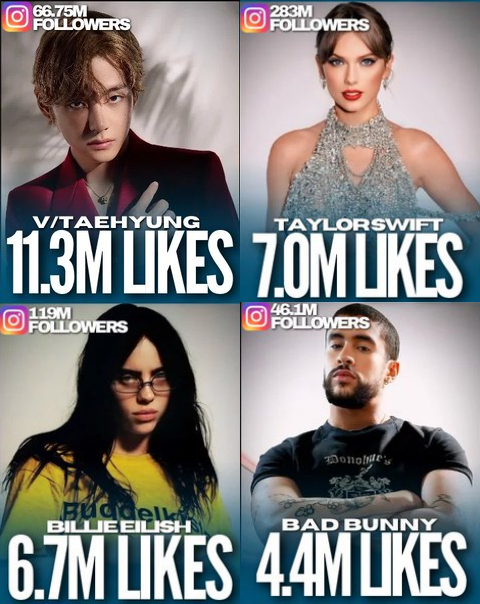 최근 인터넷 마케팅 서비스 업체인 팔랑스(Phlanx)는 아티스트들의 인스타그램 평균 '좋아요' 순위를 발표했다. 뷔는 포스팅 당 평균 1130만 개 '좋아요'를 기록하며 1위에 올랐다. 2위는 2억 8400만 팔로워를 보유하고 있는 테일러 스위프트가 평균 '좋아요' 700만개를 획득했다.