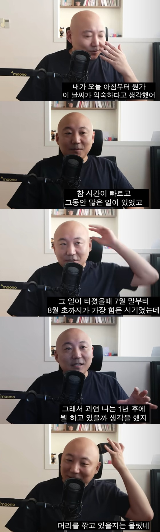 이어 주호민은 "그 일이 터졌을 때, 7월 말부터 8월 초까지 가장 힘든 시기였는데 어쨌든 이것이 다 지나갈 거라는 희망이 있지 않나. 어쨌든 모든 일은 다 지나가니까. 그래서 과연 1년 후에 난 뭘하고 있을까 생각을 했지. 근데 머리를 깎고 있을지는 몰랐네. 진짜 행복하다. 진짜 행복한 거예요, 이건"이라고 너스레를 떨었다.