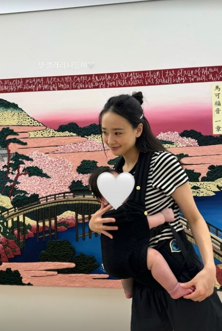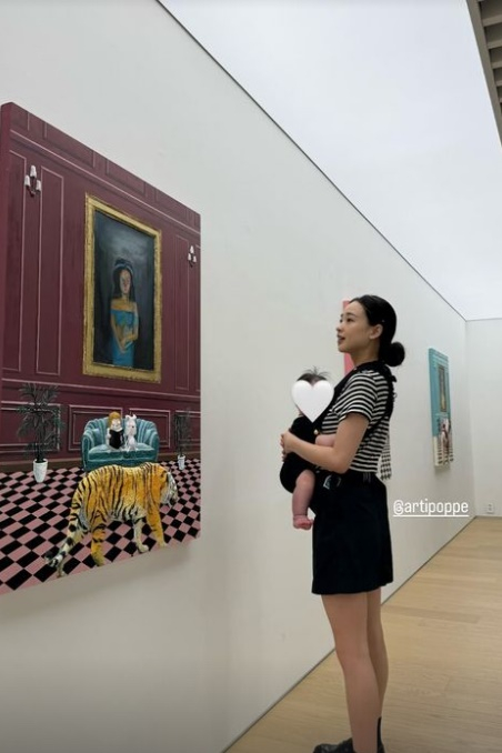 그는 아기띠를 착용하고 아이를 안은 채 그림을 감상하며 '현실 엄마'의 모습을 보여줬다.