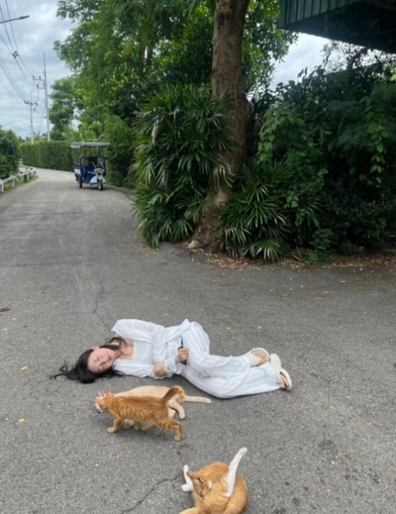 주현영은 "바람 피기 좋은 날이군"이라는 문구와 함께 태국 여행 중 만난 고양이들의 모습에 매료돼 함께 길바닥에 드러눕는 모습도 시전했다.