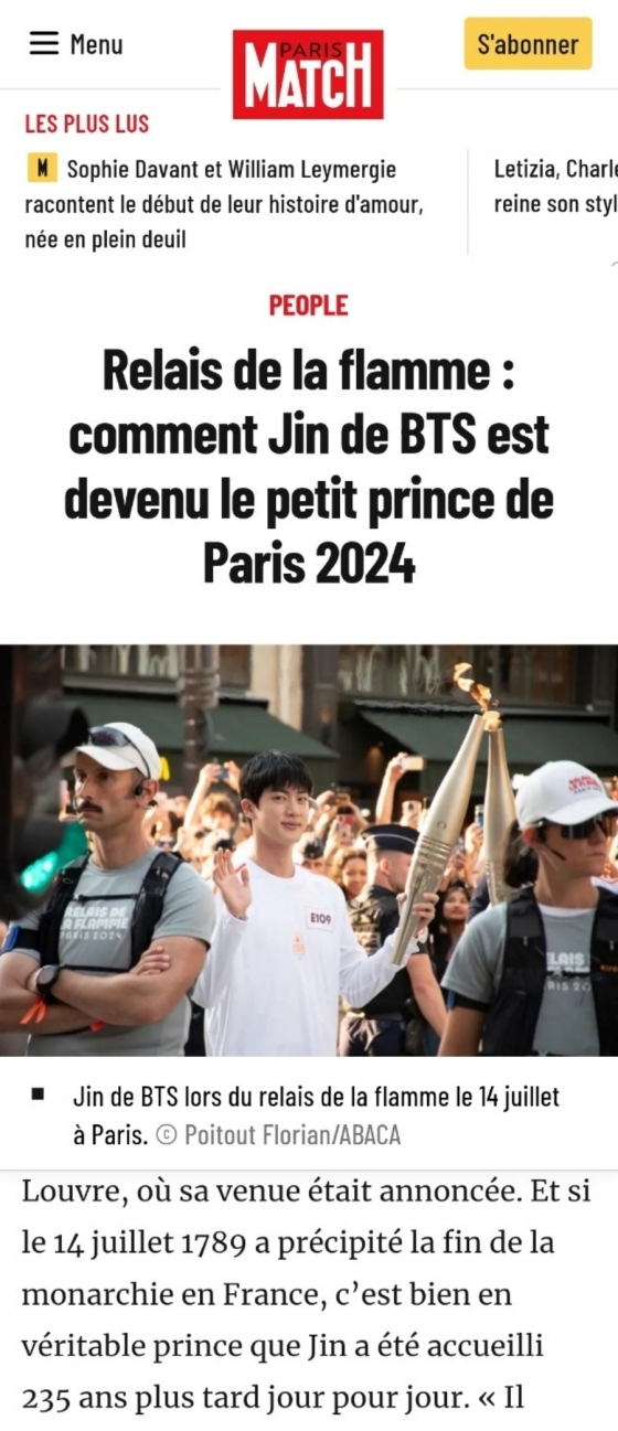 파리마치는 진의 성화 봉송 이후에는 "성화 봉송: 방탄소년단의 진 2024 파리 올림픽의 어린 왕자가 되다"라는 기사를 통해 올림픽 성화 봉송에 참여한 방탄소년단 진의 행보가 계속해서 화제를 불러일으키고 있으며, 진은 파리에서 깊은 인상을 남겼다고 전했다.